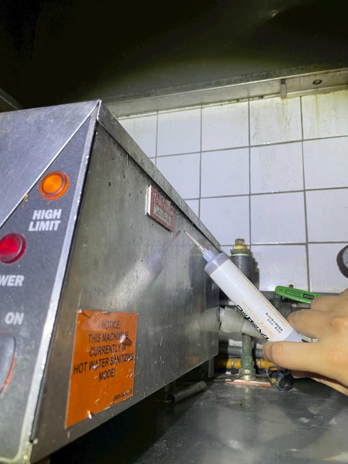 在餐飲環境中,蟑螂往往躲藏在溫暖潮濕、食物與水源充足的角落,例如廚房設備縫隙、排水管附近或加熱機器內部。照片中我們正針對洗碗機側邊的金屬縫隙進行仔細檢查與餌劑施放,這些地方溫度高、濕氣重,是蟑螂的理想藏身處。透過專業除蟲人員的經驗,我們能精準鎖定牠們常走的路徑與孳生熱點,使用低毒性、安全的凝膠餌劑,誘殺蟑螂並中斷繁殖鏈。